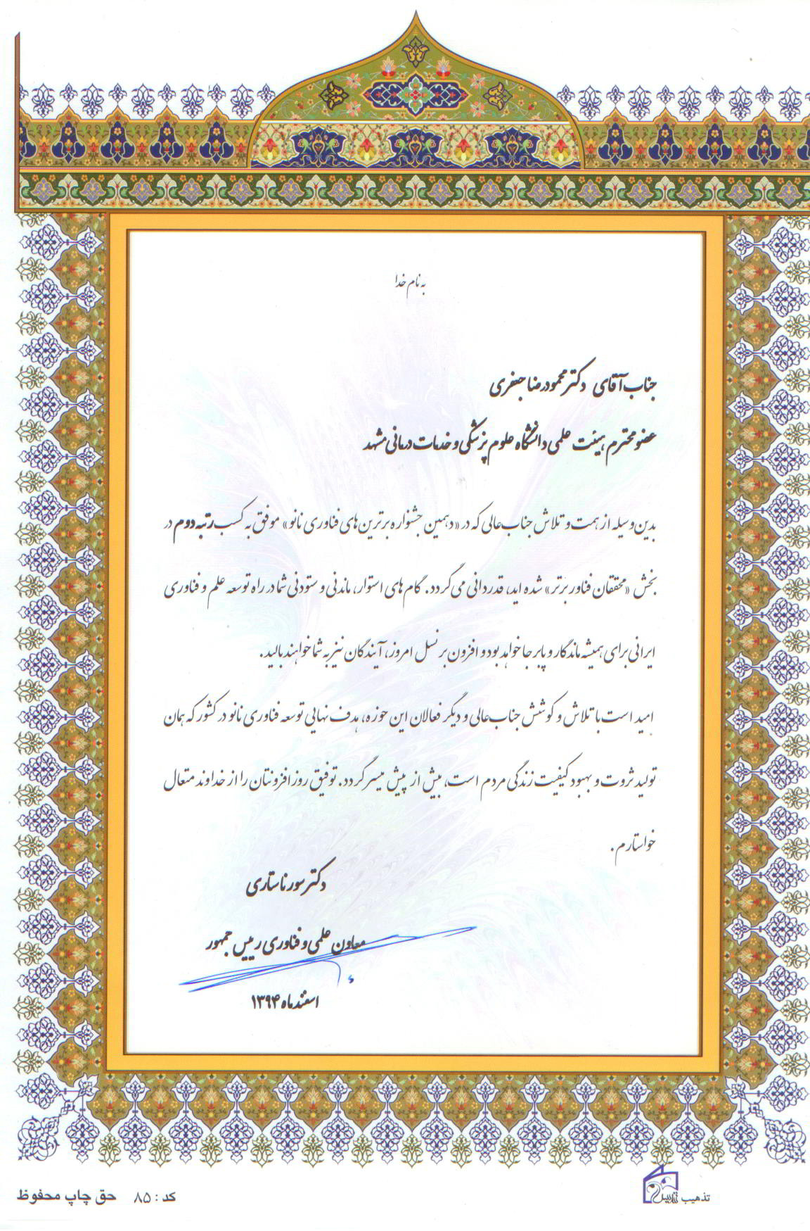 کسب رتبه دوم در دهمین جشنواره برترین های فناوری نانو توسط استاد دانشکده داروسازی آقای دکتر محمود رضا جعفری موفق به کسب رتبه دوم در دهمین جشنواره برترین های فناوری نانو در بخش "محققان فناور برتر" شده اند به ایشان تبریک گفته و آرزوی توفیقات روزافزون را داریم. |