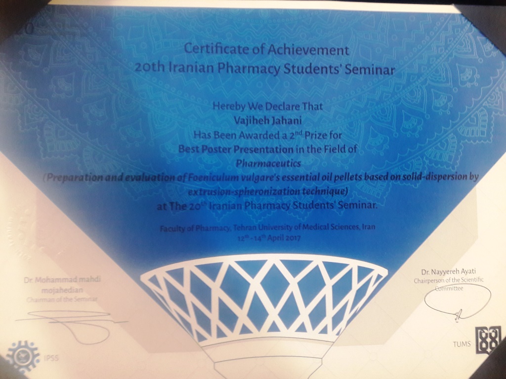 کسب رتبه دوم در بخش ارائه پوستر در سمینار دانشجویان داروسازی سرکار خانم وجیهه جهانی ( دانشجوی داروسازی ورودی 92) در بیستمین سمینار دانشجویان داروسازی که در تاریخ 23-25 فروردین در تهران برگزار شد موفق به کسب رتبه دوم در بخش ارائه پوستر در رشته فارماسیوتیکس شدند. این پروژه به راهنمایی اساتید محترم جناب آقای دکتر عباسپور و سرکار خانم دکتر جوادی انجام شد. ضمن تبریک به این عزیزان آرزومند موفقیتهای بیشتر هستیم. |