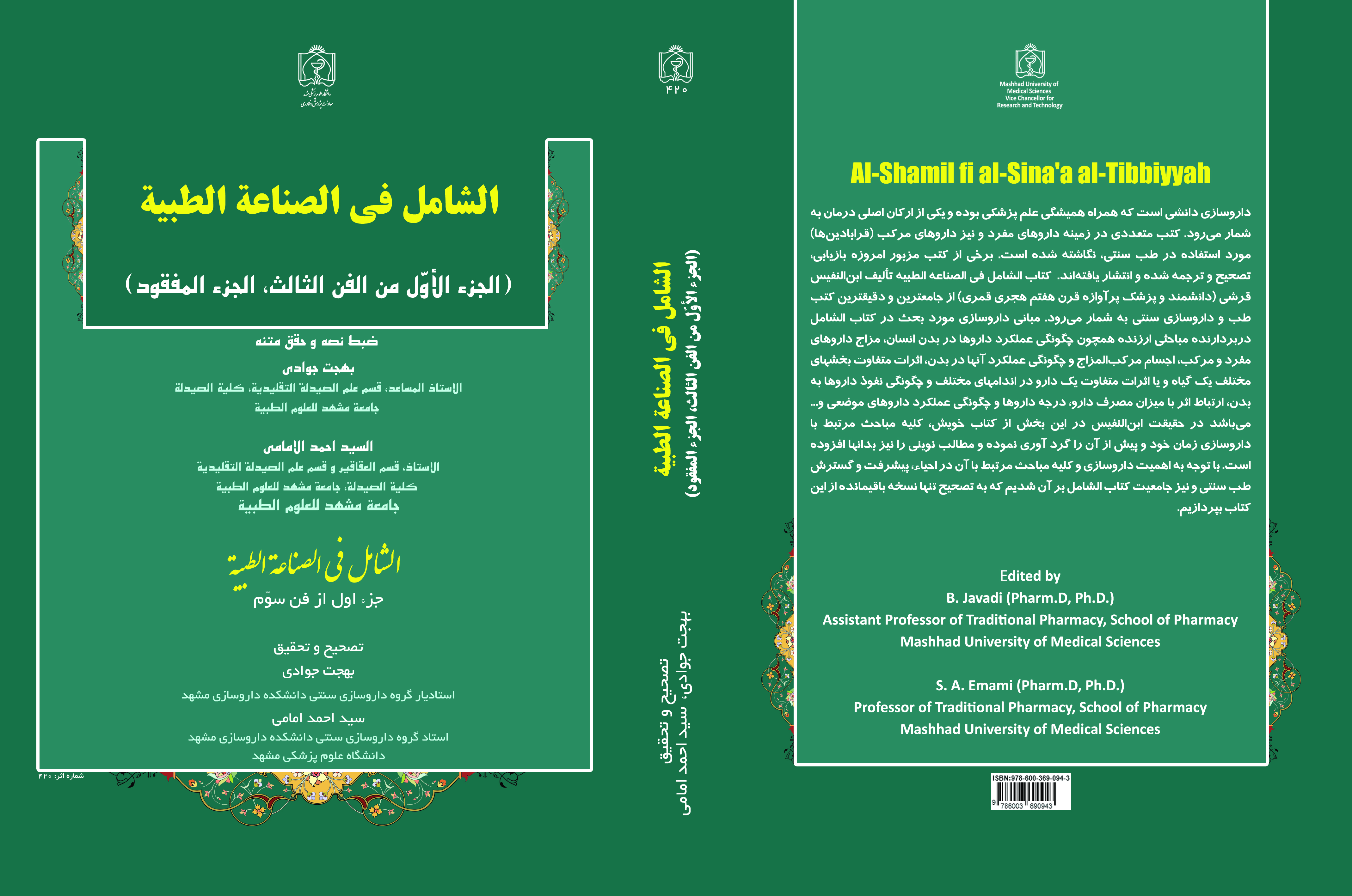 کتاب " الشامل فی الصناعه الطبیه" به تصحیح و تحقیق خانم دکتر بهجت جوادی و آقای دکتر سید احمد امامی، به تازگی توسط انتشارات دانشگاه علوم پزشکی مشهد به چاپ رسیده است. به ایشان تبریک گفته و آرزوی توفیقات روزافزون را داریم |