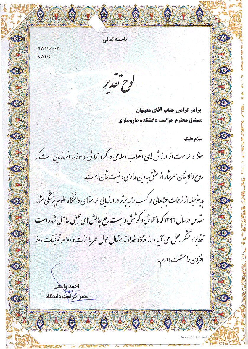 جناب آقای مرتضی معینیان مسوول محترم حراست دانشکده انتخاب دوباره جنابعالی را به عنوان حراست برتر دانشگاه علوم پزشکی مشهد در سال 1396 صمیمانه تبریک می گوییم . بی تردید کسب این مهم، نشانه جدیت و اهتمام شما در مدیریت چالشهای محیطی بوده، ضمن سپاس، از درگاه احدیت سعادت و توفیق روز افزونتان را آرزومندیم.