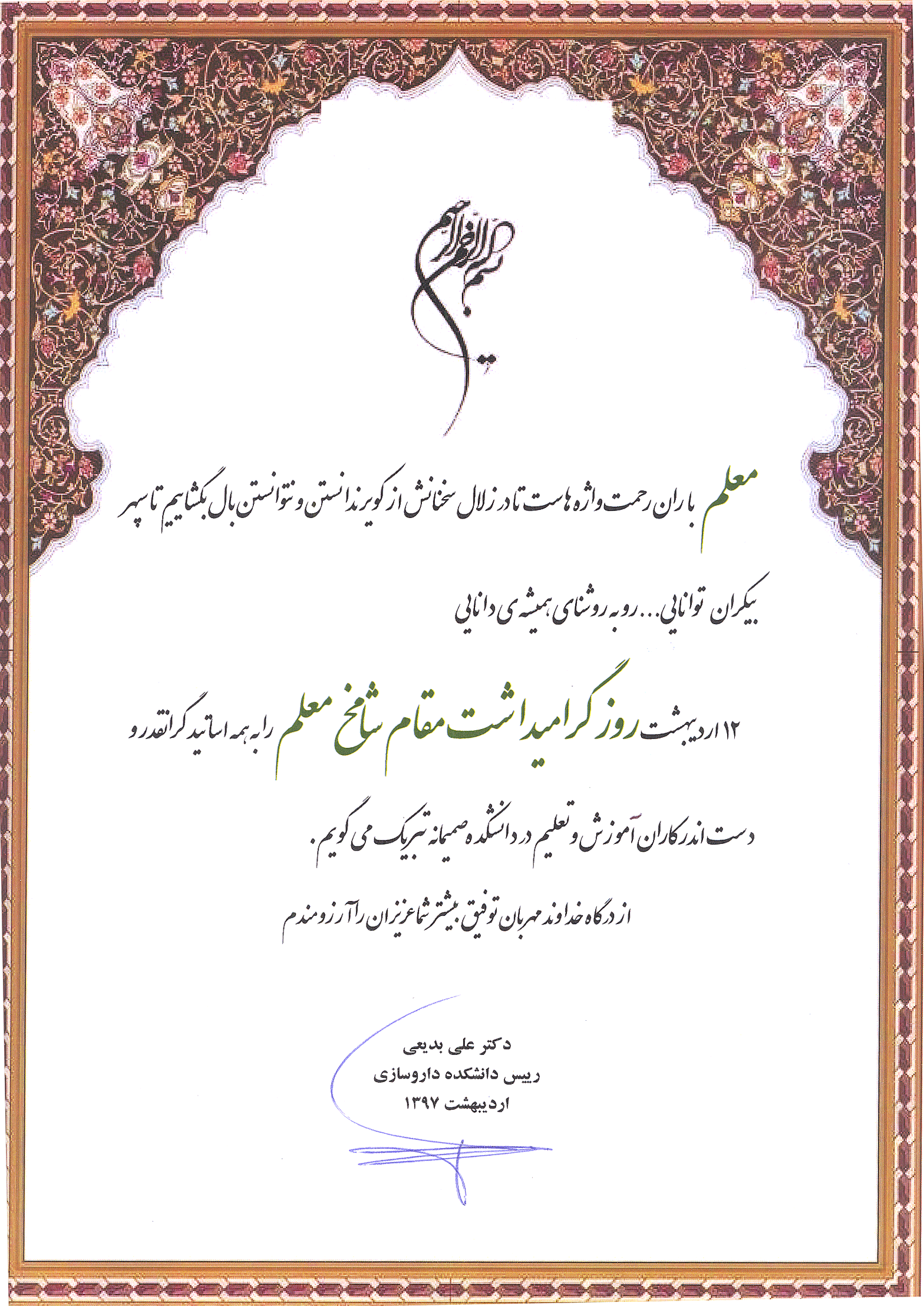 10 ارديبهشت 1397 بازدید: 371 امتیاز: ( 0 Rating ) تبریک روز معلم امتیاز کاربران لطفا رای دهید رای 1 رای 2 رای 3 رای 4 رای 5 تبریک رییس دانشکده به مناسبت روز گرامیداشت مقام معلم قبلی بعدی
