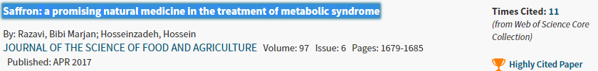 چاپ مقاله با استناد بالا مقاله زیر که توسط جناب آقای دکتر حسین زاده و سرکار خانم دکتر رضوی به چاپ رسیده است، بر مبناي پايگاه اطلاعات علمي ٌٍweb of Sciencec جزو مقالات با استناد بالا (highly cited paper) نمایه شده است . این مقاله در پایگاههای اطلاعاتی گوگل اسکولار، اسکوپوس و WOS به ترتیب 20، 14، 11 بار ارجاع داشته است.به ایشان در چاپ این مقاله ارزشمند تبریک می گوییم . Razavi, B.M., Hosseinzadeh, H.Saffron: a promising natural medicine in the treatment of metabolic syndrome. (2017) Journal of the Science of Food and Agriculture, 97 (6), pp. 1679-1