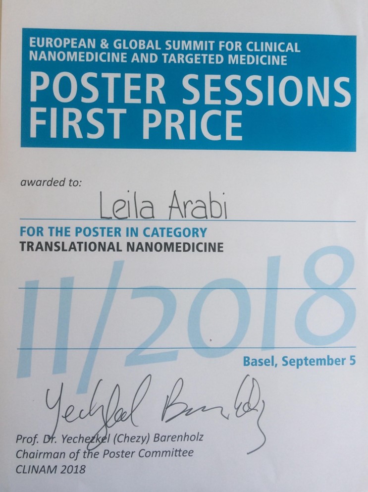 | کسب جایزه بهترین پوستر درهمایش European and Global Summit for Clinical Nanomedicine توسط سرکار خانم دکتر عربی |
