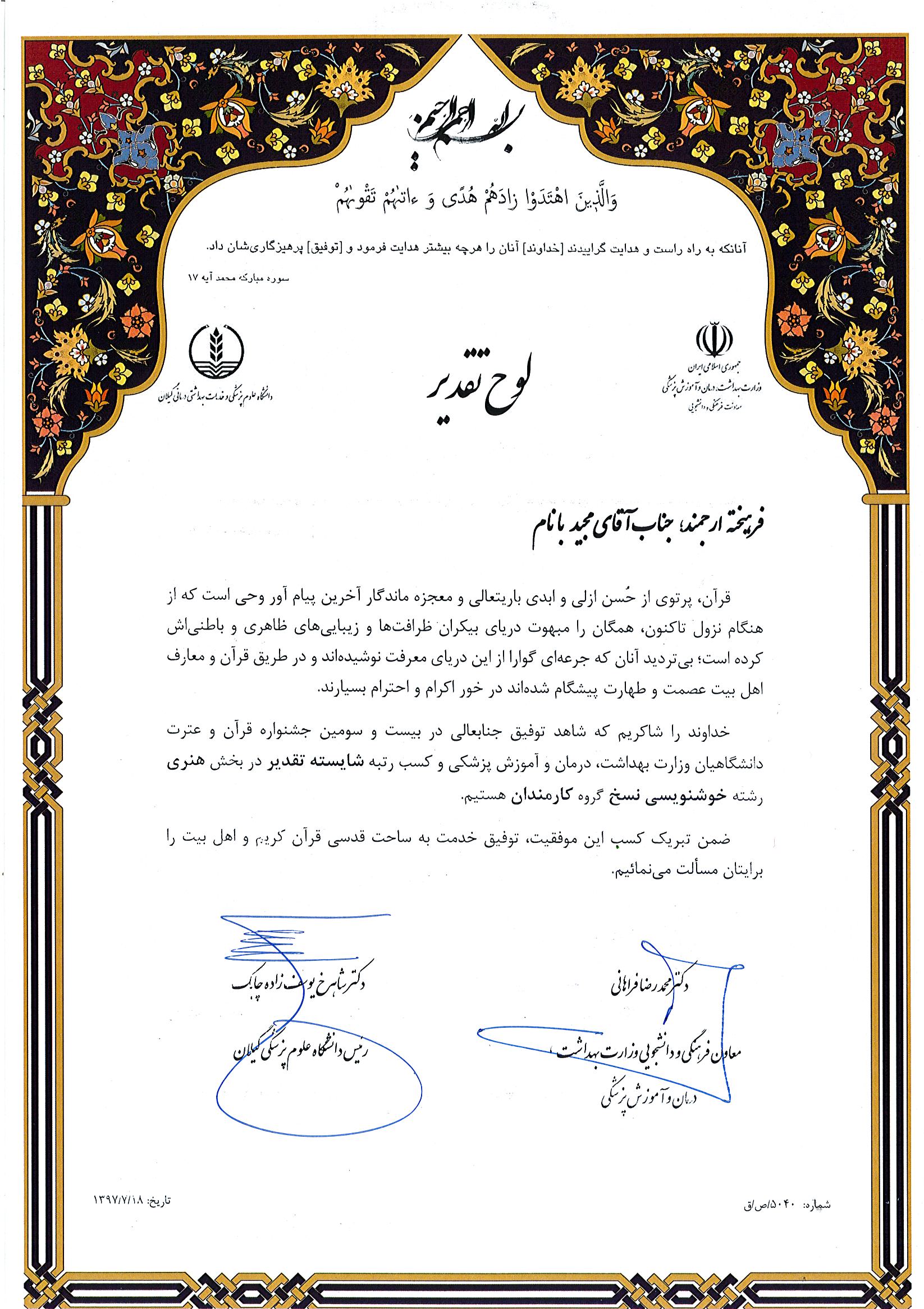 کسب رتبه "شایسته تقدیر" در بخش هنری توسط آقای مجید بانام آقای مجید بانام در رشته خوشنویسی در بیست و سومین جشنواره قرآن و عترت دانشگاهیان وزارت بهداشت موفق به کسب رتبه "شایسته تقدیر " در بخش هنری گردیدند. به ایشان در کسب این موفقیت تبریک می گوییم.