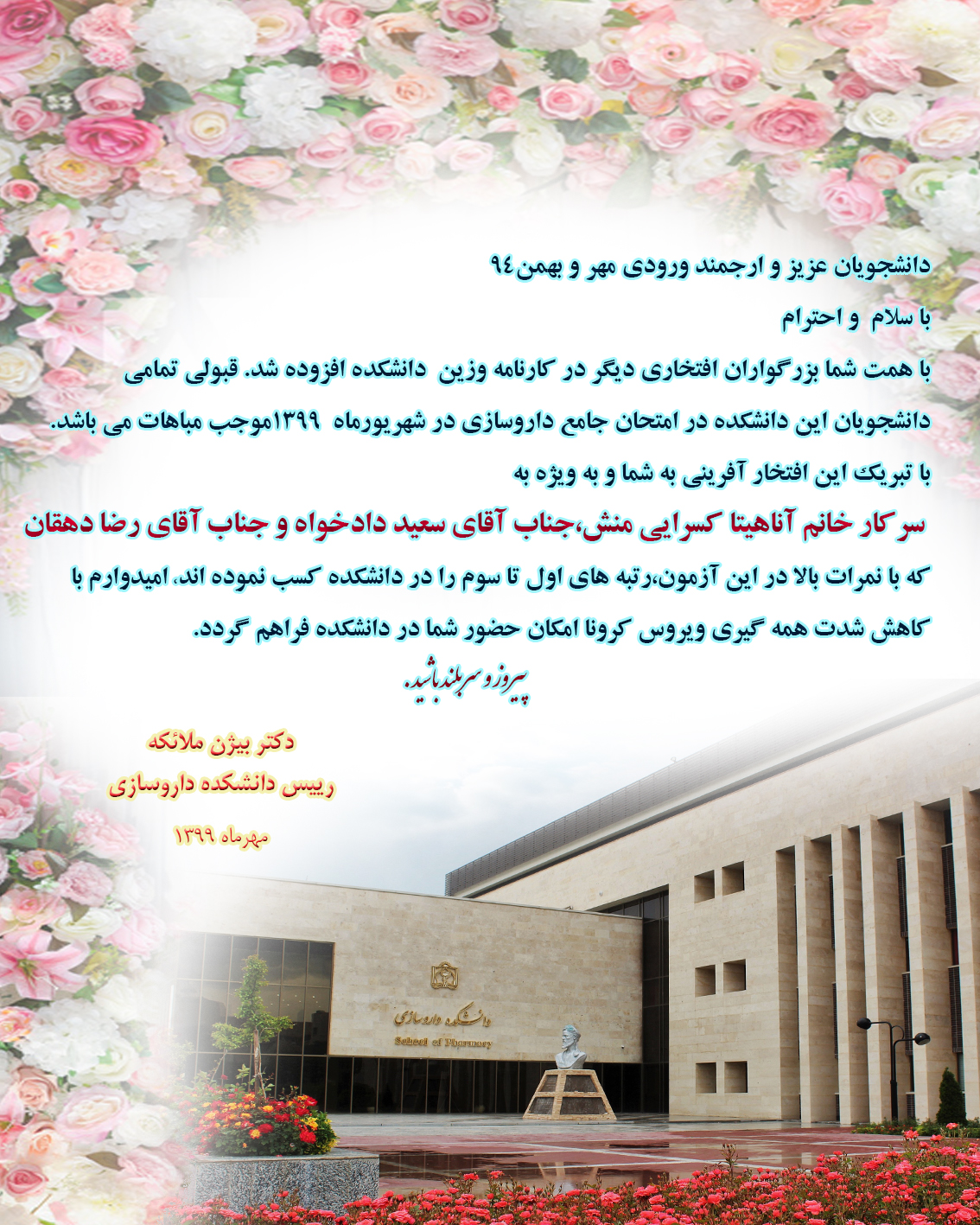 با همت دانشجویان ورودی مهر و بهمن1394 بار دیگر افتخاری زرین به کارنامه وزین دانشکده افزوده شد. تمامی دانشجویان این ورودی در امتحان جامع داروسازی در که در شهریورماه سال جاری برگزار شد موفق به کسب نمره قبولی شدند. ضمن تبریک این موفقیت به همه این عزیزان به ویژه سرکار خانم آناهیتا کسرایی منش،جناب آقای سعید دادخواه و جناب آقای رضا دهقانکه با نمرات بالا در این آزمون،رتبه های اول تا سوم را در دانشکده کسب نموده اند امیدواریم شاهد افتخارآفرینی های بیشتر این بزرگواران در مراحل بعدی درس و زندگی باشیم. روابط عمومی و معاونت دانشجویی فرهنگی دانشکده |