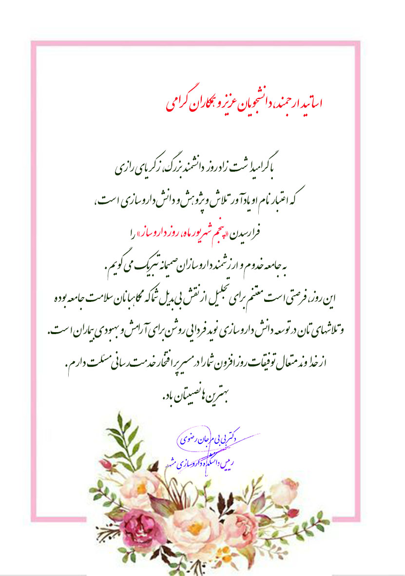 با گرامیداشت زاد روز دانشمند بزرگ، زکریای رازی که اعتبار نام او یادآور تلاش و پژوهش و دانش داروسازی است ، فرا رسیدن «پنجم شهریور ماه، روز داروساز» را به جامعه خدوم و ارزشمند داروسازان صمیمانه تبریک می گویم. این روز، فرصتی است مغتنم برای تجلیل از نقش بیبدیل شما که نگاهبانان سلامت جامعه بوده وتلاشهای تان در توسعه دانش داروسازی نوید فردایی روشن برای آرامش و بهبودی بیماران است. از خداوند متعال توفیقات روزافزون شما را در مسیر پر افتخار خدمترسانی مسئلت دارم. بهترین ها نصیبتان باد.