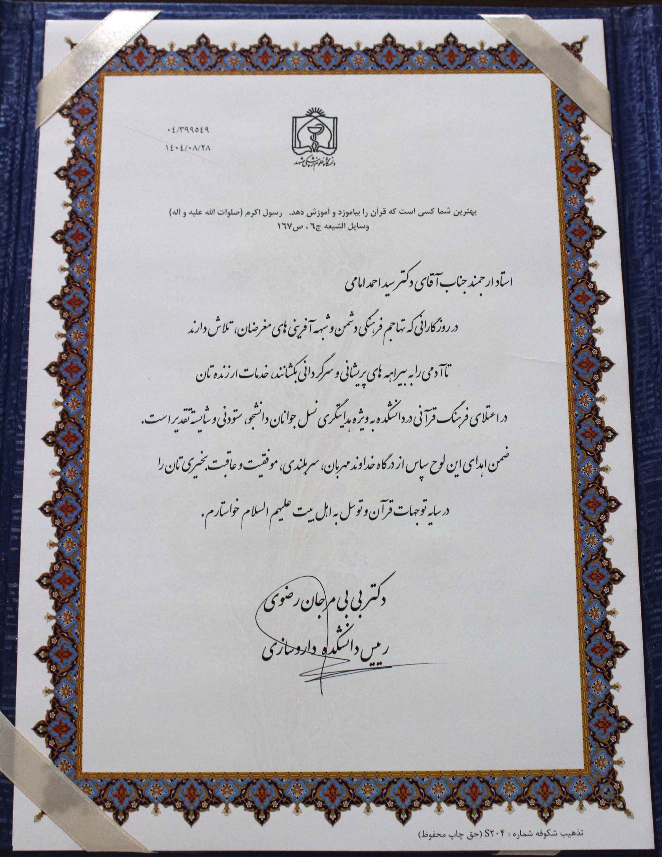 همزمان با ایام سوگواری دهه فاطمیه و شهادت حضرت فاطمه زهرا سلام الله علیها و بمناسبت گرامیداشت هفته قرآن و عترت دانشگاه، از فعالان و برگزیدگان حوزه قرآنی دانشکده در دو بخش اساتید و دانشجویان تقدیر به عمل آمد. خانم دکتر رضوی ریاست دانشکده در سخنانی ضمن تقدیر از برگزیدگان گفت: اینکه می بینیم علیرغم همه آسیب های فرهنگی و نقشه های شیطانی دشمنان، جوانان برومند مان در کنار تحصیل، در میدان معارف و قرآن نیز گام برداشته و افتخارآفرینی می کنند نوید بخش فردایی روشن برای جوانان حقیقت جو و تلاشگر است. دانشکده وظیفه خود می داند تا با حمایتهای بیش از پیش از فعالیتهای غیر درسی دانشجویان، برای استمرار این فعالیتها و کسب افتخارات، جهت دهی بیشتر داشته باشد. آقای مهدی کاظمی مدیر فرهنگی معاونت فرهنگی و دانشجویی دانشگاه نیز حضور دانشجویان علوم پزشکی و به ویژه دانشجویان داروسازی را در حوزه های معارف دینی و قرآنی، قابل ستایش دانست و گفت: مایه خرسندی است که شاهد باشیم جوانان دانشجوی ما علاوه بر افتخارآفرینی در درس و آموزش و پژوهش، اینگونه علاقه مند و مشتاق به علوم معارفی بوده و بی تردید معاونت فرهنگی و دانشجویی دانشگاه تلاش می کند بسترهای لازم را برای بهره برداری بیشتر از این استعدادها فراهم سازد.