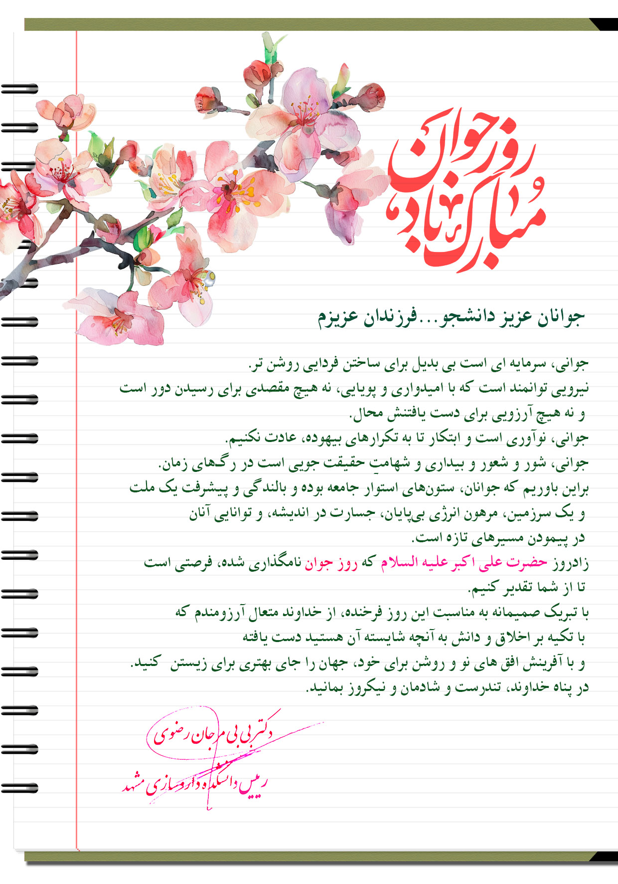 جوانی، سرمایه ای است بی بدیل برای ساختن فردایی روشن تر. نیرویی توانمند است که با امیدواری و پویایی، نه هیچ مقصدی برای رسیدن دور است و نه هیچ آرزویی برای دست یافتنش محال. جوانی، نوآوری است و ابتکار تا به تکرارهای بیهوده، عادت نکنیم. جوانی، شور و شعور و بیداری و شهامتِ حقیقت جویی است در رگهای زمان. براین باوریم که جوانان، ستونهای استوار جامعه بوده و بالندگی و پیشرفت یک ملت و یک سرزمین، مرهون انرژی بیپایان، جسارت در اندیشه، و توانایی آنان در پیمودن مسیرهای تازه است. زادروز حضرت علی اکبر علیه السلام که روز جوان نامگذاری شده، فرصتی است تا از شما تقدیر کنیم. با تبریک صمیمانه به مناسبت این روز فرخنده، از خداوند متعال آرزومندم که با تکیه بر اخلاق و دانش به آنچه شایسته آن هستید دست یافته و با آفرینش افق های نو و روشن برای خود، جهان را جای بهتری برای زیستن کنید. در پناه خداوند، تندرست و شادمان و نیکروز بمانید.